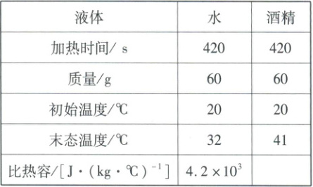② 记下两种液体的初始温度,接通电路,加热一段时间后,记下液体的末态温度,数据记录如下表。(该实验过程中应保证酒精的温度低于沸点)