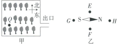 10. 某巡查小组进入森林后在Q处迷失方向。图甲为小组利用卫星技术获取的森林俯视图,他们携带的指南针静止时的指向如图乙所示。他们为尽快找到出口,应选择的方向是(