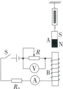 10. 如图所示,A是悬挂在弹簧测力计下的条形磁铁,B是电磁铁。闭合开关S,电磁铁B上端为