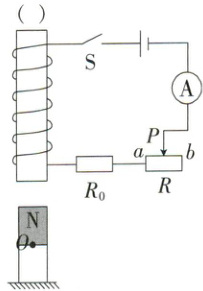 3. 如图所示,条形磁铁竖直放在水平地面上,上方为加入铁芯的螺线管,闭合开关后,通电螺线管与条形磁铁产生力的作用。请你标出通电螺线管上端的极性和条形磁铁竖直向下的受力示意图($O$为力的作用点)。
