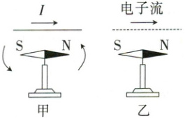 有关。小明由此推测:若一束电子流沿着水平方向平行地飞过小磁针正上方(如图乙),小磁针也将发生偏转。此时小磁针的$N$极会向纸外