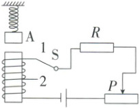 8. 如图所示,弹簧下端悬挂一铁块$A$,当开关$S与触点2$接触时,通电螺线管的上端是
