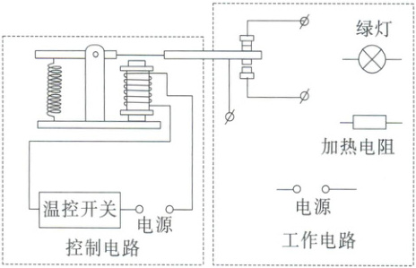 10. 某同学设计的冬季家庭温度自动控制器的工作原理图如图所示。当室内温度低于$25^{\circ}C$时温控开关闭合,绿灯不亮,加热电阻工作;温控开关断开,绿灯亮,表示温度已经达到$25^{\circ}C$。请根据以上要求,用笔画线代替导线连接电路。