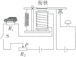 9. 下图是某道路限载报警器的工作原理图。电源电压不变,$R_{1}$是力敏电阻,其阻值随压力的变化而变化。闭合开关$S$,当车的质量超过限载质量时,电磁铁吸下衔铁,电铃响。根据不同的路面可以改变滑动变阻器滑片$P$的位置,来设定不同的限载质量。下列说法正确的是(
