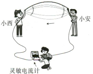 7. 如图所示,在“摇绳发电”实验中,小西和小安把一条大约8m长的电线的两端连在灵敏电流计的两个接线柱上,形成闭合导体回路,如图所示,然后他们沿某一方向站立并迅速摇动这条电线,发现灵敏电流计的指针摆动。在该实验中,灵敏电流计的作用是用来检测