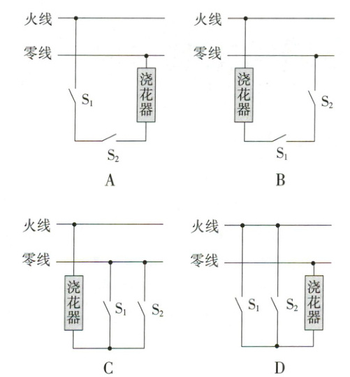 9. 小明设计了一种晚上自动给花草浇水的电路,要求浇花器仅在土壤过于干燥的夜间才开始工作,对花草进行浇水。光控开关$S_1$在天黑时闭合,湿敏开关$S_2$在土壤过于干燥时闭合,下列电路能满足上述条件的是(