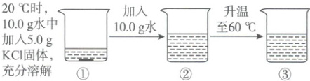 10. $20^{\circ}C和60^{\circ}C时KCl的溶解度分别为34.0g和45.5g$,下图为对$KCl$进行的溶解实验。下列分析
