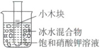 11. 试管内盛有$20^{\circ}C$的饱和硝酸钾溶液,其上漂浮一小木块。如下图所示,将试管插入烧杯内的冰水混合物中,一段时间后,下列有关说法