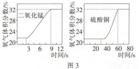 (3) 硫酸铜对过氧化氢分解也有催化作用。为比较二氧化锰和硫酸铜对过氧化氢分解快慢的不同影响,用图2装置进行实验。启动传感器,注入过氧化氢溶液。氧气体积分数随时间的变化情况如图3所示。