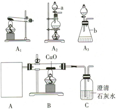 (填“A₁”“A₂”或“A₃”)装置生成 CO 气体,然后与 B 装置对接完成实验。(3) 写出 B 装置硬质玻璃管中发生反应的化学方程式: