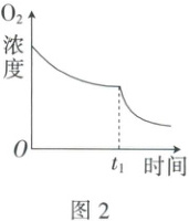 7. 小明进行如下实验,装置如图 1,广口瓶内 $ O_2 $ 浓度随时间的变化如图 2。操作如下: