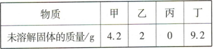 7. $20^{\circ}C$时,取甲、乙、丙、丁$4种纯净物各20g$,分别加入$4个各盛有50g$水的烧杯中,充分溶解,其溶解情况如下表(温度保持在$20^{\circ}C$)。下列说法正确的是(