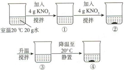 10. 为探究硝酸钾的溶解性,进行了下图实验,其中溶液①、溶液③中没有剩余固体,溶液②、溶液④中有剩余固体。请回答以下问题。