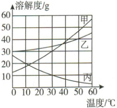 g。(2) $30^{\circ}C$时,甲、乙、丙三种物质的溶解度由大到小的顺序为