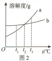 10. $t_{3}^{\circ}C$时,将相同质量的$a和b$两种固体分别加入盛有等质量水的甲、乙烧杯中,充分溶解后温度不变,现象如图1所示,图2为两种物质的溶解度曲线。以下说法