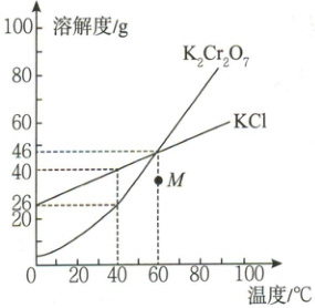 C.$60^{\circ}C$时,$M点对应的K_{2}Cr_{2}O_{7}溶液和KCl$溶液均不饱和