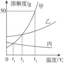 D.将等质量的甲、乙、丙饱和溶液,从$t_{3}^{\circ}C降到t_{1}^{\circ}C$,溶液的质量大小关系为______