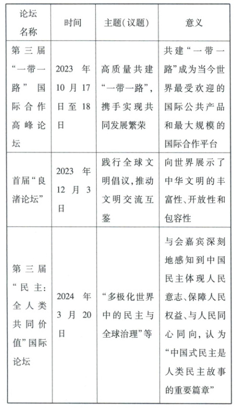 ①“一带一路”促进了各国之间的经济合作和共同发展,为构建人类命运共同体提供了物质基础。“一带一路”加强了各国之间的互联互通,增进各国之间的相互了解和信任,为构建人类命运共同体创造了有利条件,有利于建设一个共同繁荣的世界。②首届“良渚论坛”推动了不同文明之间的交流互鉴,有助于消除误解和偏见,增进各国人民之间的友谊和相互尊重;展示了中华文明的魅力和包容,向世界传递了和平、合作、开放的理念,为构建人类命运共同体提供了文化支撑和价值引领,有利于建设一个开放包容的世界。③“民主:全人类共同价值”国际论坛增进了国际社会对中国民主的了解和认同,为其他国家提供了民主发展的新视角和新选择,促进了全球民主治理的多元化;倡导了民主在全球治理中的重要作用,推动各国以更加公平、公正、包容的方式解决全球性问题,共同应对挑战,为构建人类命运共同体营造了良好的政治环境,有利于建设一个普遍安全的世界。