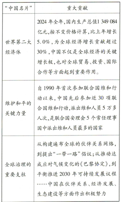 8. (探究与实践题)党的二十大报告指出,中国式现代化是走和平发展道路的现代化。我们坚定站在历史正确的一边、站在人类文明进步的一边,高举和平、发展、合作、共赢旗帜,在坚定维护世界和平与发展中谋求自身发展,又以自身发展更好维护世界和平与发展。