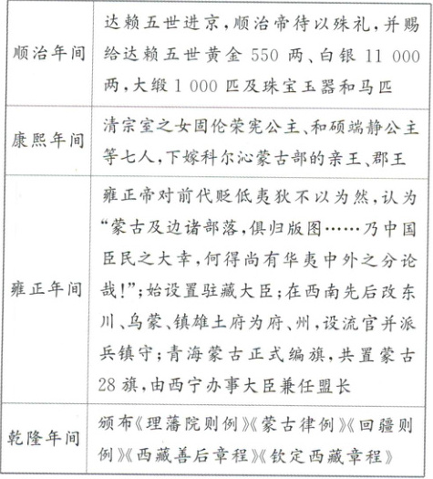 思考 根据史料,概括清朝边疆治理中的制度创新,并结合所学知识,比较明清时期治边理念的变化。