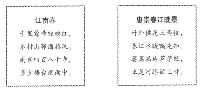 代表性景物 莺啼、绿树、红花、水村、山郭、酒旗等 竹子、桃花、江水、鸭子等