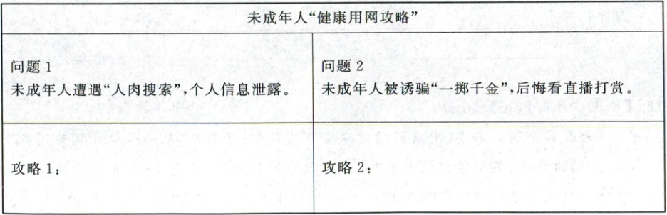 (3)与法同行,未成年人责无旁贷。请你针对以下问题,运用所学知识,制定一份未成年人“健康用网攻略”。(6 分)