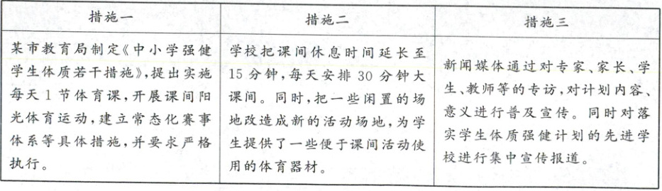 经过对多个学校的调研,同学们发现,开学以来,学校体育活动开展情况发生了很大变化,令人欣喜。对此,小秦提出疑问:不同主体通过哪些措施推动学生体质强健计划落到实处?为此,同学们搜集整理了以下资料。