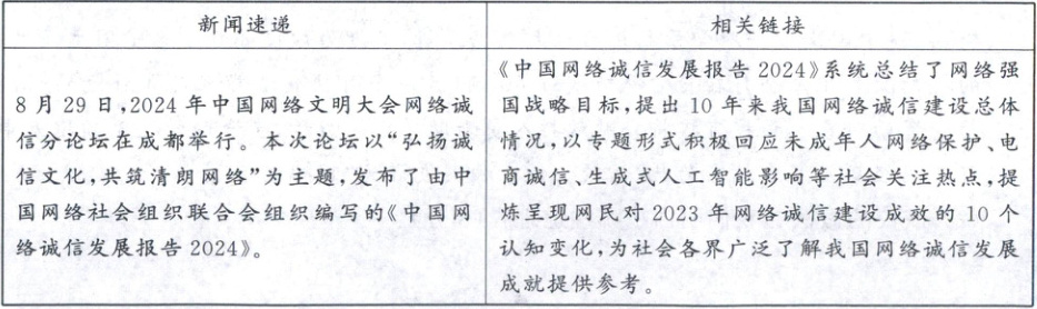 (2)结合材料二新闻速递及相关链接,运用诚信的相关知识,分析说明积极推动我国网络诚信建设的时代价值。(6 分)