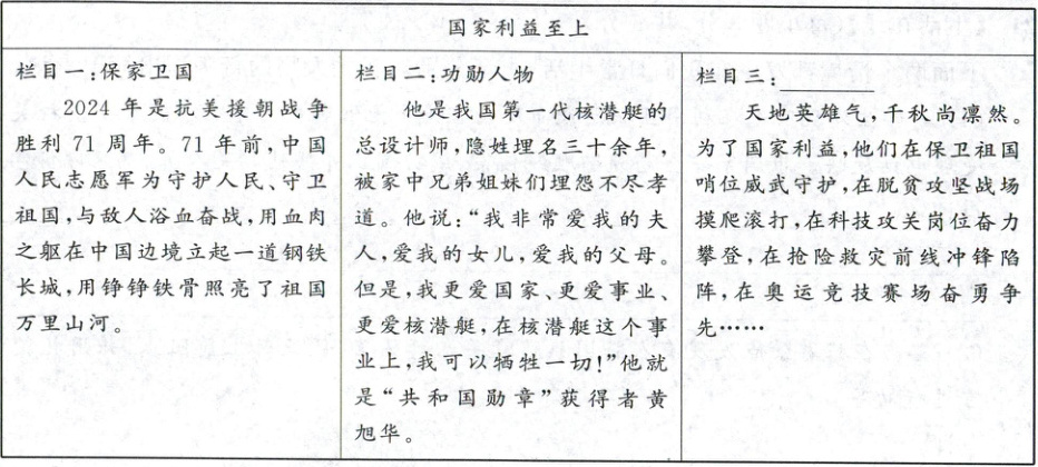 (3) 请补充栏目三的小标题,并依据栏目三里的内容,写出一位你最崇敬的英雄及他身上值得你学习的精神品质。(2 分)
