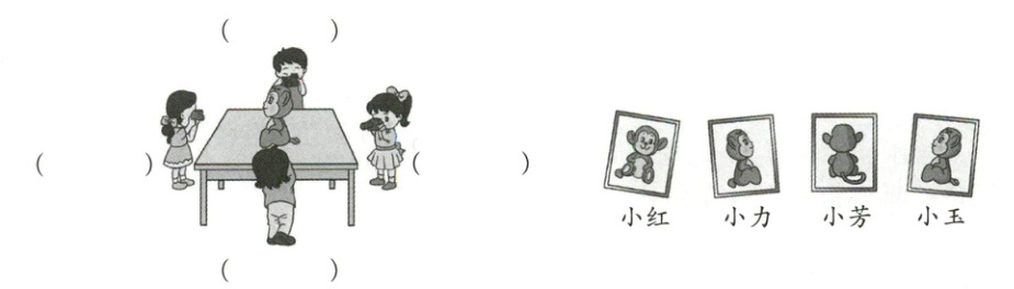 1. 下面四张照片是四个小朋友从不同的位置拍到的。根据照片,把他们的名字填在相应的括号里。