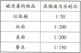 3. 每天放学后学校都要用次氯酸钠稀释液对教室的桌面、地面进行消毒,每次需要$80.4$L的稀释液。下面是次氯酸钠浓缩液的使用配制比,学校每次需要准备多少毫升的次氯酸钠浓缩液?