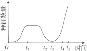 解析:选 A。由题图可知,$t_{1}$时刻前绿藻种群数量增长呈“S”形,其数量的增长受自身种群密度的制约,种群密度越大,种内竞争越剧烈,增长越缓慢,A 不合理;$t_{2}\sim t_{3}$时期种群数量较少,若不考虑捕食因素,依据题干信息推测,应是冬季降水量少,冲刷到水体中的营养物质减少,浮游生物生长缓慢,B 合理;$t_{4}\sim t_{5}$时期内绿藻种群呈“J”形增长,可能是 N、P 等物质过多引起的,此时水体可能呈富营养化状态,C 合理;$t_{1}\sim t_{5}$时期,水体中的营养物质含量存在差异,故 K 值会发生变化,D 合理。