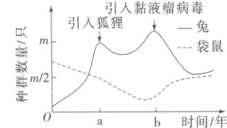 解析:选 D。由题意可知,由于兔子放生到澳大利亚农场,新环境中食物和空间条件充裕,故其能迅速繁殖,A 正确。狐狸以兔子为食,二者是捕食关系;黏液瘤病毒寄生在兔子体内,二者是寄生关系,B 正确。引入狐狸后,兔的数量减少,同时袋鼠的数量也减少,由此可以推断狐狸也是袋鼠的捕食者,C 正确。在对兔进行防治时,应在种群数量未达到$m/2$之前进行,因为在$m/2$时种群数量增长速率最快,若超过$m/2$后进行防治,兔子数量已经快速增长,防治难度会加大,D 错误。