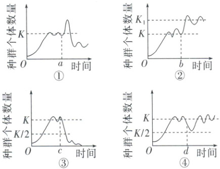 解析:选 A。由题图①可知,a 点后种群数量超过 K 值之后先上升后下降,并且不能恢复原 K 值,可以代表过度放牧后草原生态系统被破坏,种群的 K 值下降,A 合理;由题图②可知,K 值增大了,若曲线代表某发酵罐中的菌种数量,则 b 点可能增加了营养物质的供应,也可能提供了充足的氧气等,B 不合理;由题图③可知,c 点后种群数量从 K 值附近开始下降,最后变为 0,说明该生态系统受到干扰,且之后不再适合该种群生存,但不能表明该生态系统一定崩溃了,C 不合理;由题图④可知,d 点后种群数量低于 K 值先下降然后恢复,若代表某种鱼,d 点后该种群数量没有下降到$K/2$以下,则不能代表过度捕捞,D 不合理。