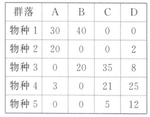 (2)湖池、蚌湖等四个(A、B、C、D)生物群落含有五个物种(物种1~5),每个物种的数目如下表所示。其中丰富度最大的群落是