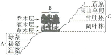 (3) 有人说:“B 处桦树高低错落有致,只存在垂直结构,而野草丛比较矮小,只存在水平结构”,这种说法是否正确?