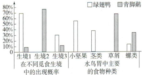 4. 研究人员调查了某湿地上两种水鸟在三种主要觅食生境中出现的概率以及主要的食物种类,统计结果如下图所示。下列说法错误的是 ( )