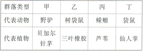 4. 甲、乙、丙、丁四种群落类型的代表动物和代表植物分布情况见下表,下列推测不合理的是 ( )