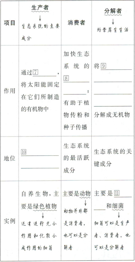 (1)③非生物的物质和能量 ④生产者 ⑤消费者 ⑥分解者 (2)⑦光合作用 ⑧物质循环 ⑨动植物遗体残骸和动物的粪便 ⑩生态系统的基石 ⑪真菌 (3)⑫生产者
