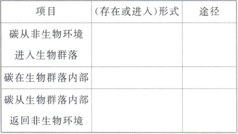 (1)项目 (存在或进入)形式 途径 碳从非生物环境进入生物群落 CO₂ 光合作用、化能合成作用 碳在生物群落内部 含碳有机物 食物链、食物网 碳从生物群落内部返回非生物环境 CO₂ 呼吸作用、分解作用等;