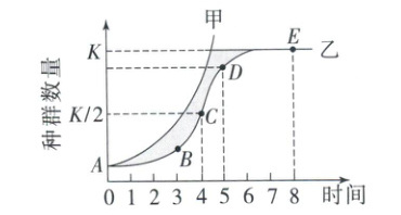 D.若乙表示草履虫种群增长曲线,当种群数量达到E点后,种群中衰老个体将逐渐增加