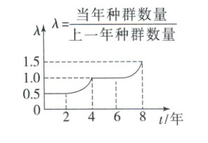 2. (2025·四川成都高二检测)研究人员调查了8年间某养兔场兔种群数量的变化情况,并据此绘制了下图的$ \lambda $值变化曲线,以下叙述正确的是(