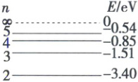 例 2 (多选)氢原子能级图如图所示,当氢原子从 $n = 3$ 跃迁到 $n = 2$ 的能级时,辐射光的波长为 $656\ \mathrm{nm}$。以下判断正确的是(