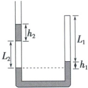 (2) 环境温度保持 $ T_{2} = 300 \, K $ 不变,现从左管口缓慢倒入水银,恰好使左右两侧水银面的高度差恢复到 $ h_{1} = 4 \, cm $,求左管中需要倒入的水银柱的长度。