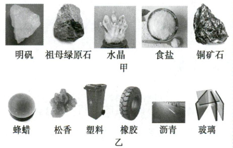 1. 图甲是日常生活中常见的几种晶体,图乙是生活中常见的几种非晶体,请在图片基础上思考以下问题:
