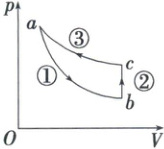 1. (热力学第一定律与图像的综合)(2024·河北张家口开学考)一定质量的理想气体由状态$a$经①过程到状态$b$,由状态$b$经②过程到状态$c$,由状态$c$又经③过程回到状态$a$,①过程气体不与外界发生热传递,③过程温度保持不变。整个过程压强$p与体积V$的关系如图所示,下列说法正确的是(