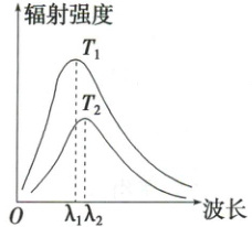 1. (黑体和黑体辐射)(2024·湖北武汉模拟预测)人们认识量子论的第一步始于对黑体辐射实验规律的解释,如图画出了$T_1、$$T_2$两种温度下黑体的辐射强度与其辐射光波长的关系,下列说法正确的是(