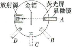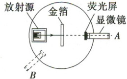 3.(α粒子的散射实验)如图所示的是卢瑟福α粒子散射实验装置的示意图,图中的显微镜可在圆周轨道上转动,通过显微镜前相连的荧光屏可观察α粒子在各个角度的散射情况。下列说法正确的是 (