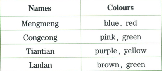 )2. Congcong and Tiantian both(都) like green.任务二:Lanlan 打算用自己喜欢的颜色画一些鸟,根据表格内容完成句子。