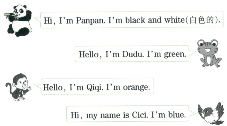 五、〔新角度〕大熊猫 Panpan 和朋友们在森林里玩耍,他们在说些什么呢?请读一读,为下列动物选择相应的颜色,在表格中相应的位置画“√”。